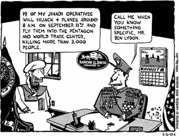 By the way, we, uh, forgot to mention, that in August of 2001, while the President was taking a long vacation at his ranch in Crawford, the CIA told him that, uh, Osama bin Laden might be planning to hijack an airliner as part of some, who-knows-what terrorist action against the United States.