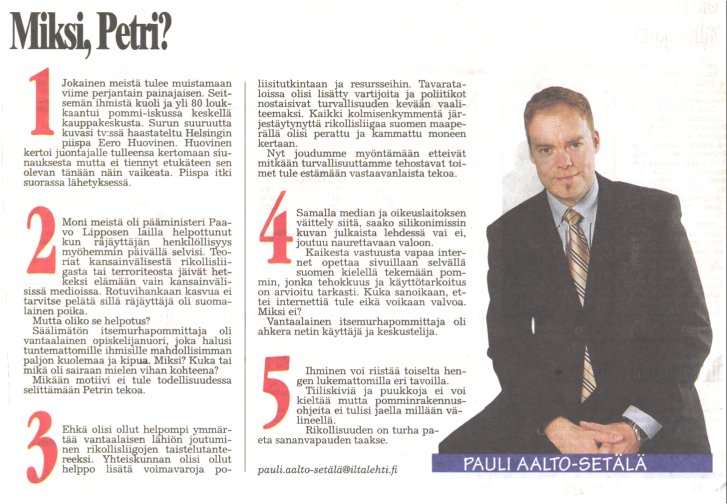 Noin. Markus Kajo on halunnut nettiin rajoituksia Hesarissa ja tänään Aamulehdessä, joten Kajon juttuun otan kantaa sitten lisäämällä tähän tekstiin yhden kappaleen, ja kunhan saan sen Aaltopetisedän jutun käsiini niin Iltalehteen lähtee sitä käsittelevä versio. Ilta-Sanomiin, ellei Kajo kerkeä sinnekin, illalla tämä teksti. Parannusehdotukset ovat tervetulleita, en ole kirjoittanut mielipidekirjoitusta lehteen muutamaan vuoteen.