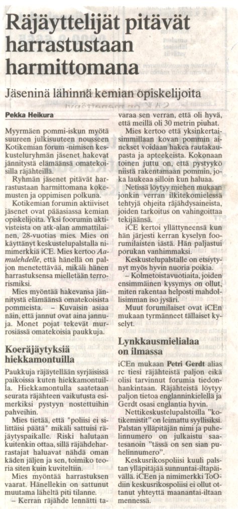 Gerdt kävi internetissä ja osallistui sen keskustelupalstoille kuten tuhannet muut suomalaiset nuoret. Tietokoneen prosessorin ylikellottamisen tai konsolipelien sijaan hänen kiinnostuksenkohteensa vain sattui olemaan kemia, josta hän myös oli hankkimassa itselleen ammattia. Saman tiedon Gerdt olisi voinut luultavasti hankkia myös kirjastosta tai opinahjostaan. Samalla kun laitamme internetin suurennuslasin alle, voisimmekin kieltää kirjastot ja luonnontieteelliset aineet kouluista. Tieteellinen tieto ja sen hallussapito tai välittäminen ei ole rikos, ellei puhuta erikseen valtio - tai teollisuussalaisuuksista.