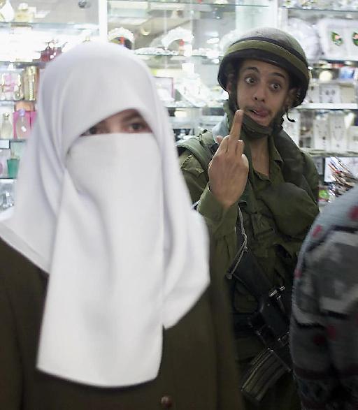 An Israeli soldier shows the finger to Palestinian shoppers braving the curfew in the divided West Bank town of Hebron 01 December 2002. At least three people, including two children, were seriously wounded when an Israeli Apache combat helicopter fired two missiles on a car east of Gaza City, Palestinian medical sources