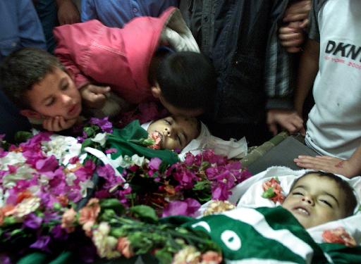 Palestinian children kiss and give the two-year-old Palestinian baby Nafez Meshal a last farewell during his funeral in Rafah refugee camp in southern Gaza Strip, November 12, 2002.
