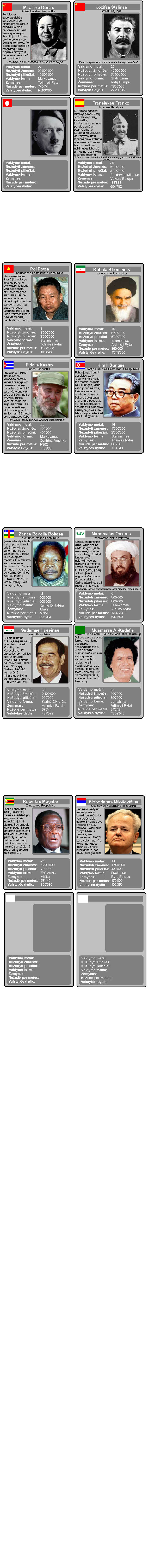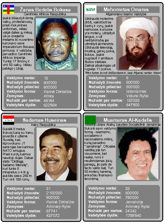 . Unfortunately, they are in Lithuanian so you might not understand it, and they are still not completed (at least some of them). They includes some more statistics, like the maximum size of country dictator ruled, avarage number of people killed per year, continent. Also my cards presents flag of the country (at a time dictator ruled), full name of the country, full name of dictator, info about attrocities he done, some famous quote by him (if available) and a colourful photo of his face. Here you can see cards I've already made (unfortunately, quality had to be reduced because of size restrictions):