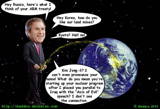 I was on this website http://maddox.xmission.com and among other things, found a hilarious page of Bush satires. Feel free to comment or post other political/Bush cartoons/satires.