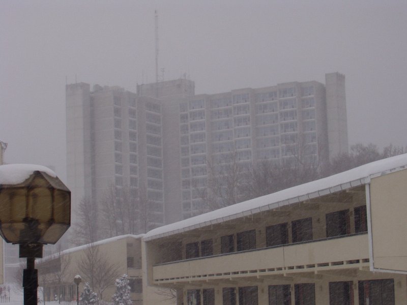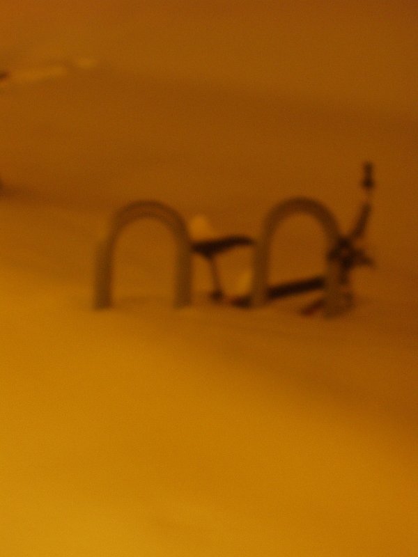 The streets are virtually empty, except for pedestrians and a smattering of brave (stupid) drivers. It's easier to walk on the streets, since they are mostly plowed whil the sidewalks are buried. Since the wind is fairly gusty, cars parked on the street are buried in drifts. I'd say the accumulation on the ground is approaching a foot, and it isn't supposed to stop until tonight.