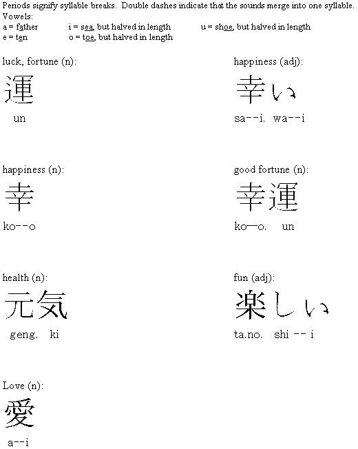 If you know pls send me JPGs of Japanese hieroglyphs that mean "luck", "happiness", "health", "fun", "love".