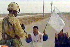 If you look at the clip on the CNN site you'll see that the two guys come up waving a white flag and are then searched and sent to the rear with their hands on their head...
