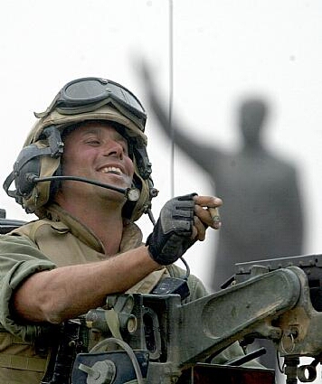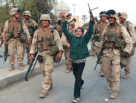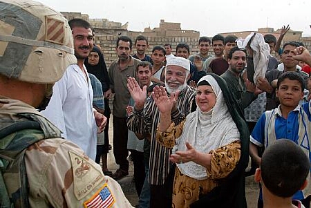 British Soldiers from 16 Air Assault Brigade throw chocolate bars from their ration packs to Iraqi children, in the village of Qaryat Nasr north of of the city of Basra, in southern Iraq, April 7, 2003.
