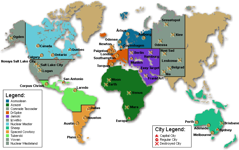 Jamski nuked the hell out of Azazel, who lost Earth & Moon. Luckily he managed to build the city Europa before all his lands turned into wasteland. Spaced Cowboy also nuked someone: Comrade Tassadar, who lost both cities.