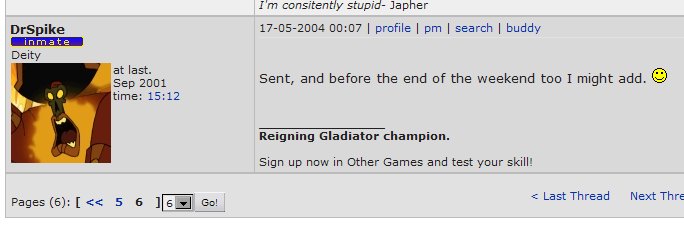 "Hah! We don't have any lions left, remember? The last lot we tried to feed to them turnied out to be martial arts experts. That was quite a mess, but very impressive to watch... Anyway, we don't have time to stand around here reminiscing. Go find those gladiators, quick!"