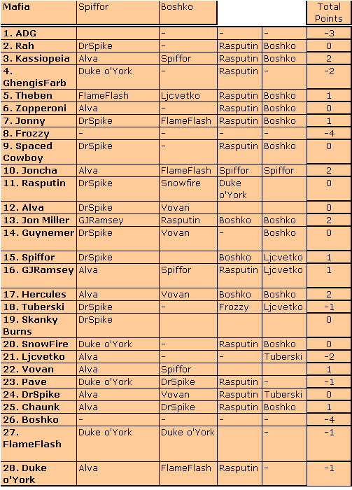 • as an example of my suggestion above, if spiffor and boshko were tha mafia, this is how the points would look including a negative point for each failure to vote...
