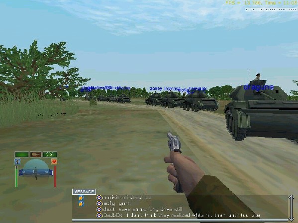 It was a long night. The British forces, and the 204 members of the Black Night Brigade had been hammering away at Kalmouth only finally taking it. Then the call on the Radio came through, the order was to form up and that we were going to attack the germans at Rosendaal Netherlands. And to meet and assemble Forward base near Kalmouth. The call went out all channels, CiC asked the 111th RAF squad to be prepared to take off from Antwerp to provide air aupport in the Blen Mk IV's and Hurricanes. A call was also sent out to assemble odds/ends like AT and AA guns at the FB. When we had all assembled it was one hell of a sight. Almost 300 people looking down the road towards rosethdaal, a single, well placed bomb from a stuka could of killed 40 of us. THe 64 player viewing limit was kicking in if we looked at too many people. So we decided to not wait around for the Luftwaffe to find us or before we all lagged to hell. Alot of the BKB veteran players Brought along the tanks from all over Belgium. When Col. b2k counted we had amassed some 50 A-13's Cruiser tanks, 7 matilda's, 6 Bedfords full of about 80 infantry and a few more bedfords towing AAA and 2 pounder guns. So we had lots of people involved in this attack.
