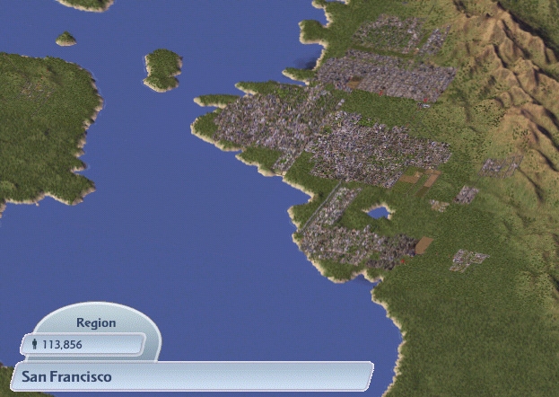 ) And I also am just starting two new ones on the right-hand side. They are all connected to each other, so basically, in each city, the demands are sky-high for any type of industry, housing, and commerce. I then pick and choose what kind of city I want - poor populace + dirty industry, or a sort of rural farmer's village, a wealthy community, or a bustling commercial district, and zone the tiles, and services accordingly. Since the sims freely move around the cities, the demand is shared, and everyone can find a place according to their education and wealth.