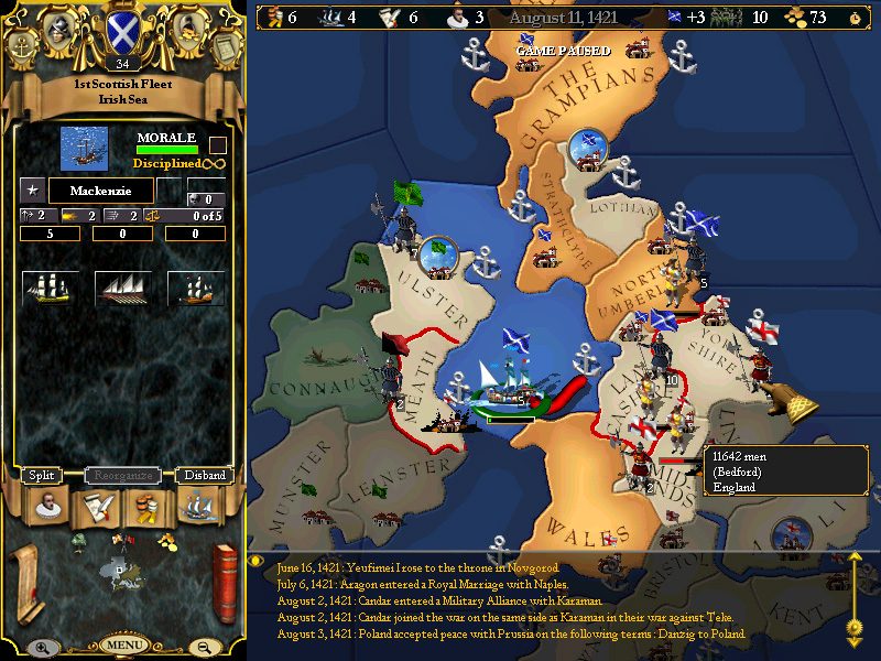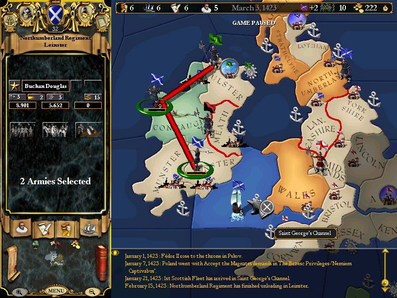 A secondary purpose to the war will be to either gain territory at Irish expense OR to gain Ireland as a vassal for income that way (note - if we do this, then we had best be ready to spend some coin in a diplomatic push to boost relations with Ireland after the fact).
