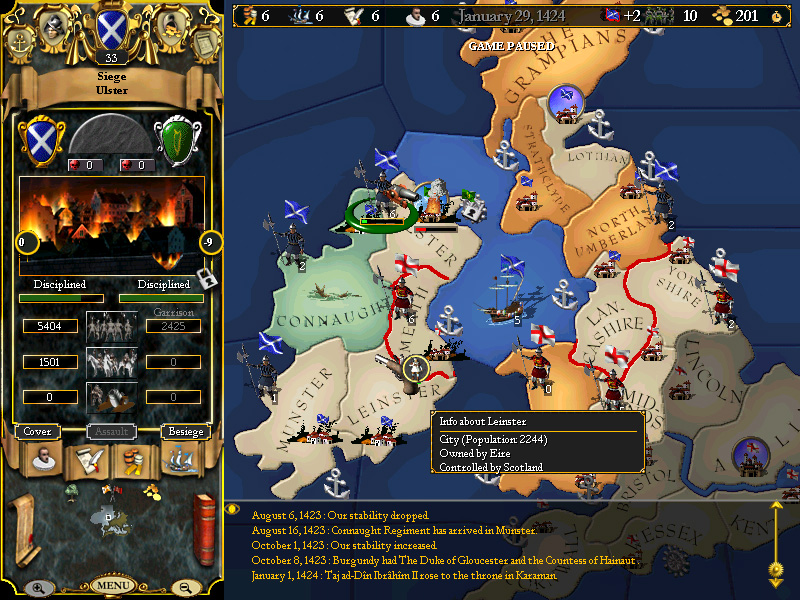 By June, the Army of Douglas has recovered, and makes a second attempt, again leaving the reserve force in Connaught to recieve Irish survivors, and this time, we meet with success! By January 1424, we have utterly destroyed the Army of Ireland (had to chase them to Leinster to finish them off), and are verging on total victory....