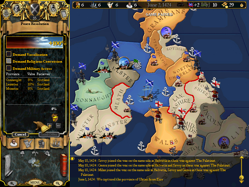 General Ravagon....we have achieved a war score of 100% over Eire in the year of our Lord 1424, on June the 2nd....whilst I am posting screenies of the battles that occured to get us to that position, the land is at your disposal....what say you, insofar as terms of surrender for our inept Irish opponents?