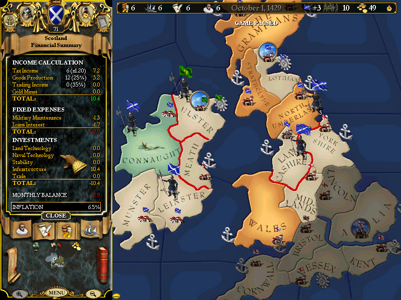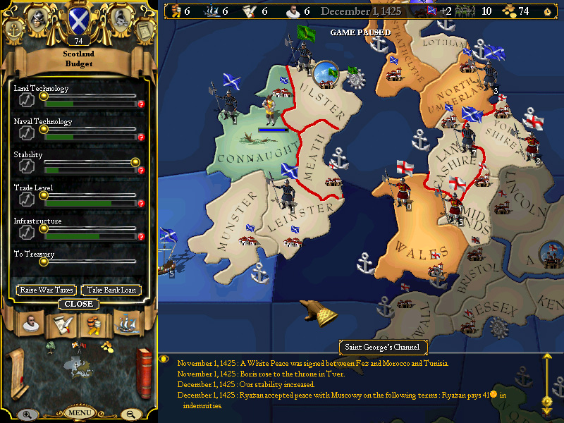 October 1st - Our third loan is paid in full, national stability returns to +3 (dipped to +2 when we further centralized the government), and England stands....empty and unguarded as her troops sail for the continent. If ever there was a time to strike....that time is now.