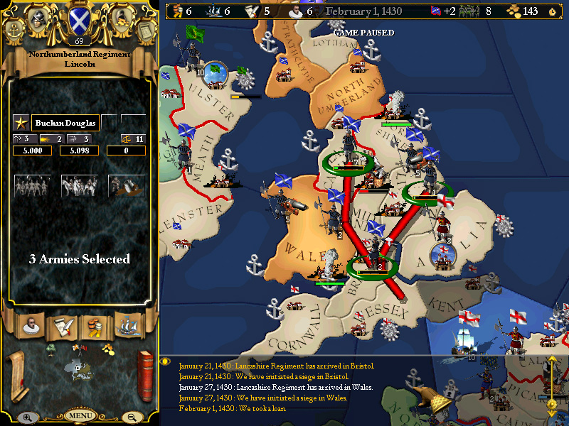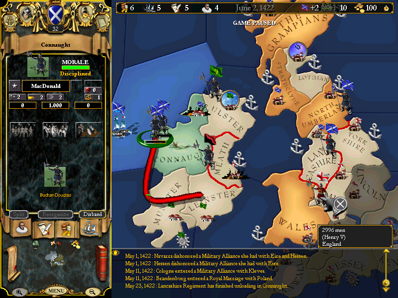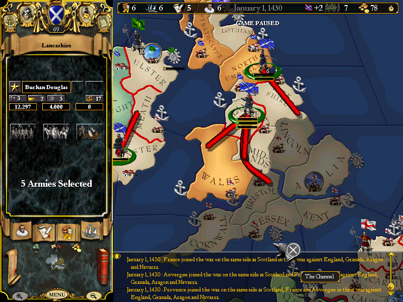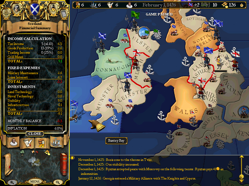 February 14, 1426 - Provence declares against Savoy, drawing our alliance into a war with Savoy, Genoa and Milan. At this time, we are still promoting tax collectors in our unfortified Irish provinces, and so we post the naval squadron off the coast of Munster with small garrisons in Leinster and Connaught, in the event of an (admittedly unlikely) Italian landing in Ireland.