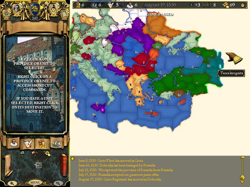After we are repulsed from Venetia by a surprise attack launched against us by a tiny band of cavalry, we successfully beseige Steirmark while, after countless victories, our fleet is send to the bottom. Our army, meanwhile, survives and marches on Istria. It is only when our army is annihilated that we are forced to sue for peace in Febuary of 1522. The next years were spent rebuilding our army and navy and soon it was ready again and in Febuary of 1522, we landed troops in Rumelia while the Rumelian armies were off fighting the Anatolians. Despite losing two entire expeditionary forces, the third force we raise finally manages to take Dobrodja in August of 1530 (really long campaign against the Rumelians and I don't want to get into all the battles).