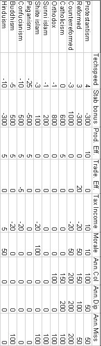 * Techspeed: % benefit that this religion gets in tech advancement (higher, more positive numbers are better). * Stab bonus: Bonus/mitigant (you must divide this by 100) received monthly towards stability. 800 = 8 ducats/month. * Prod. Eff: Production efficiency bonus, in %. * Trade Eff: Trade efficiency bonus, in %. * Tax Income: % bonus/mitigant in tax income. * Morale: Morale bonus (must divide by 100). 50 = +.50 troops morale bonus. * Ann. Col: colonists bonus (must divide by 100) received annually. 200 = +2.00 colonists/annum bonus. * Ann. Dip: diplomats bonus (must divide by 100) received annually. 200 = +2.00 diplomats/annum bonus. * Ann. Miss: missionaries bonus (must divide by 100) received annually. 200 = +2.00 missionaries/annum bonus. Gamefile put online by JohnMK.