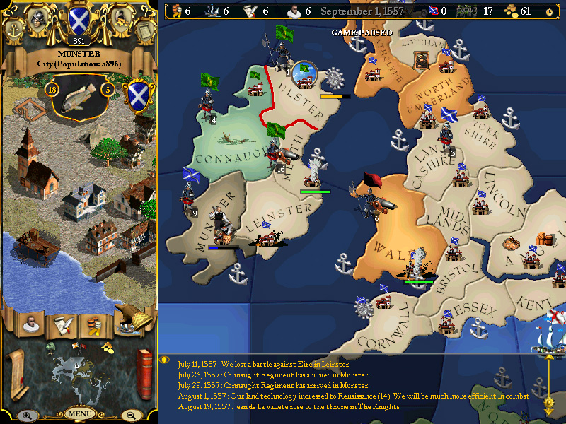 In light of this development, and seeing an opportunity to smash a smaller force, rather than attempting to go head-to-head with the main body of the Army of Ulster, Hamilton leaves the calm and capable Malcolm with a siege crew, charging him with the task of re-capturing Connaught, while he leads the bulk of our army (16,553/2642) against the 6188 Irish cavalry in Meath.