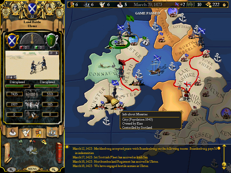 Leinster is empty and we actually have a bigger navy than somebody! WhoooHooo! I dunno....whatcha think, Rav? We could offload 5k troops in Connaught to gain the defensive bonus of the marshlands?