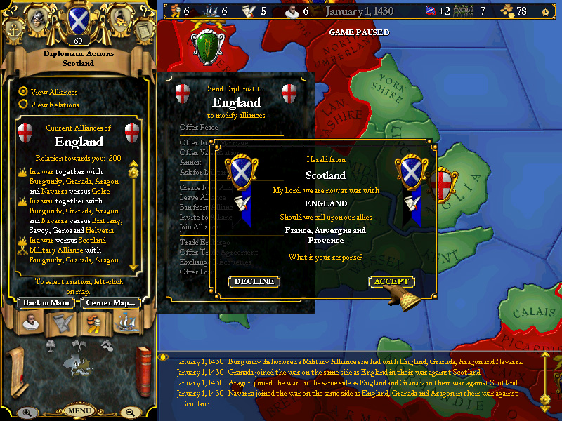 In March, England and their new, strong alliance (Burgundy, Aragon, Navarra, and Granada) declare against Gelre (burgundy is the aggressor)