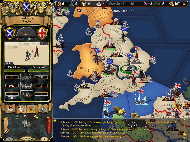 October 1st - Our third loan is paid in full, national stability returns to +3 (dipped to +2 when we further centralized the government), and England stands....empty and unguarded as her troops sail for the continent. If ever there was a time to strike....that time is now.