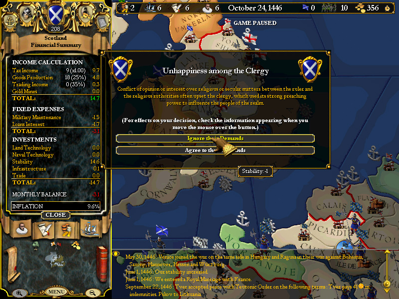 Meath, Wales, and Midlands are recognized as being part of the soveriegn nation of Scotland, we gain 100d in indemnities, and our allies in Auvergene gain Normandie. TOTAL victory!!!! - and yet, so much to do!