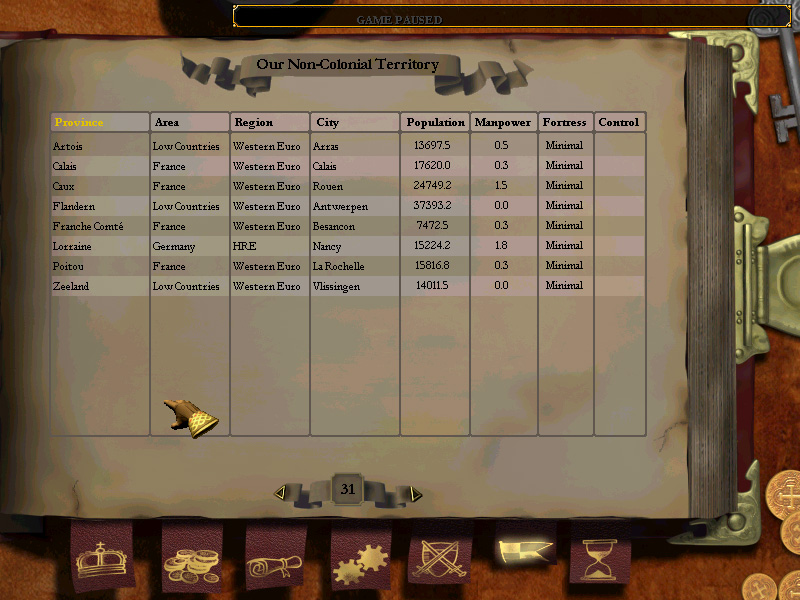 • Force review (currently we have ~10k in the Low Countries—posted to Artois—and ~5k in Poitou…nothing to guard Lorraine or Comte)…this is…certainly not ideal, but the low countries is where we can expect to see the greatest number of revolts, and Poitou is so far away that I thought it best to station a permanent garrison there….if Comte rebels, we can march troops through France from the north….again, hardly ideal, but given the scant size of our max. military at present, I was uncertain what else to do….is this an acceptable disposition of our forces, or does it need closer review?
