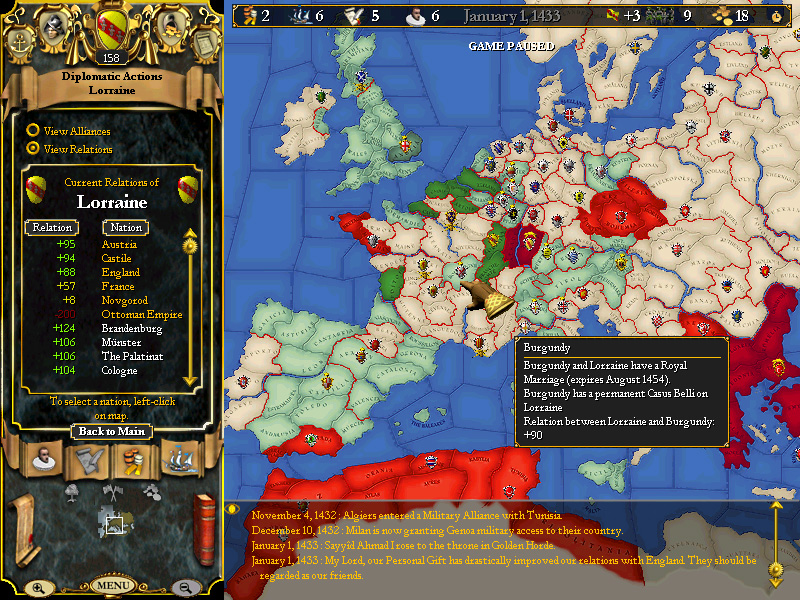 By 1433, our Duke Rene pauses to review the net diplomatic impact his efforts have had to date, and the picture for Lorraine is looking bright indeed!
