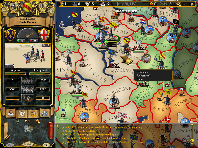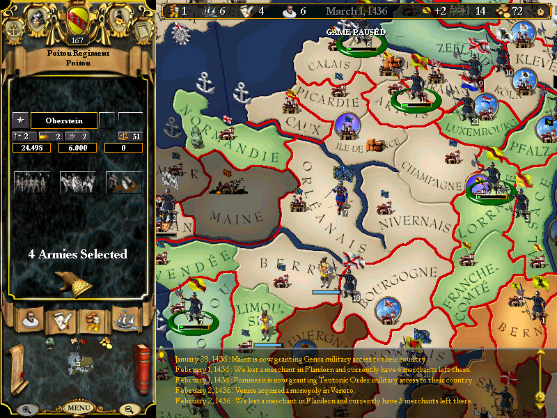 June 16th - Feeling inferior to the Armies of France, and being worried that the war leaders, Dunois and Richemont might push the whole of the French Army to Paris and grind us to dust, we hire a Mercenary Band (Gunther's) 5000/500 in Caux, and march them to Paris to increase our forces there.
