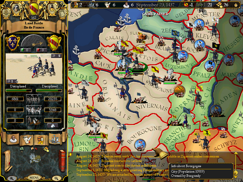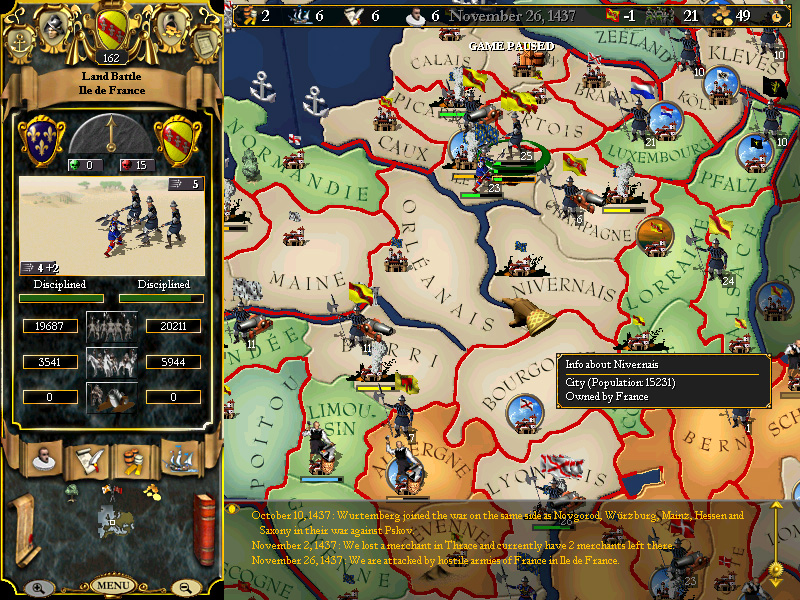 In early August, the Army of Richemont is shattered (reduced by some 50%) by 29k from Geldre marching through Champagne to Nivernais, where the dreaded General is stationed, en route to Orleanais. Overwhelmed by the men of Geldre, his army retreats across the Sein and seeks the safety of Orleanais....fortunately, it does not look like he will be attacking us any tme soon, but nor are we eager to cross the Seine from Paris and attack him.