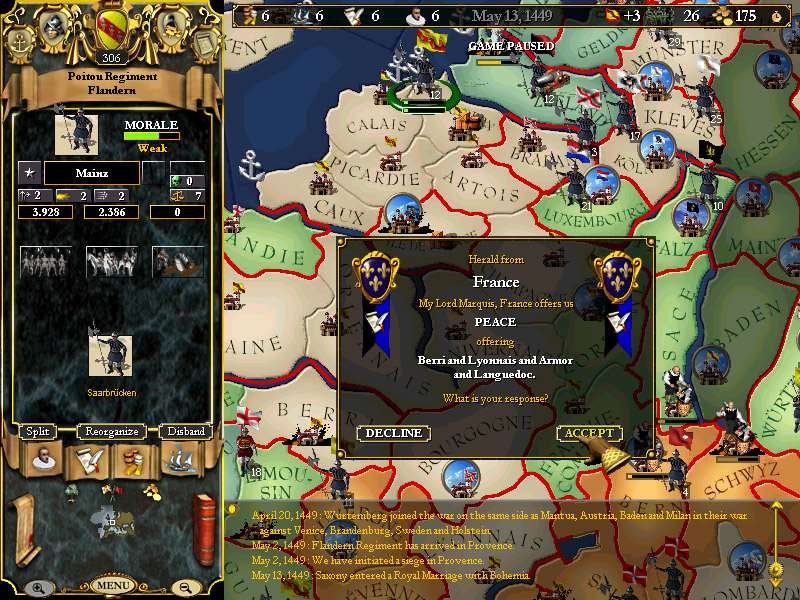 Hey man, and thank ya! Yeah, there is no doubt...England is the T-Rex of Europe in this game, and could prolly beat the snot out of the whole of the Chinese army if they were to somehow come calling!My hope is, however, that we can win a fistful of additional provinces from France and Brittany to fully unify our holdings, and gain undisputed mastery over the French provinces, then use that to chart our own dominance by eyeballing those German minors....