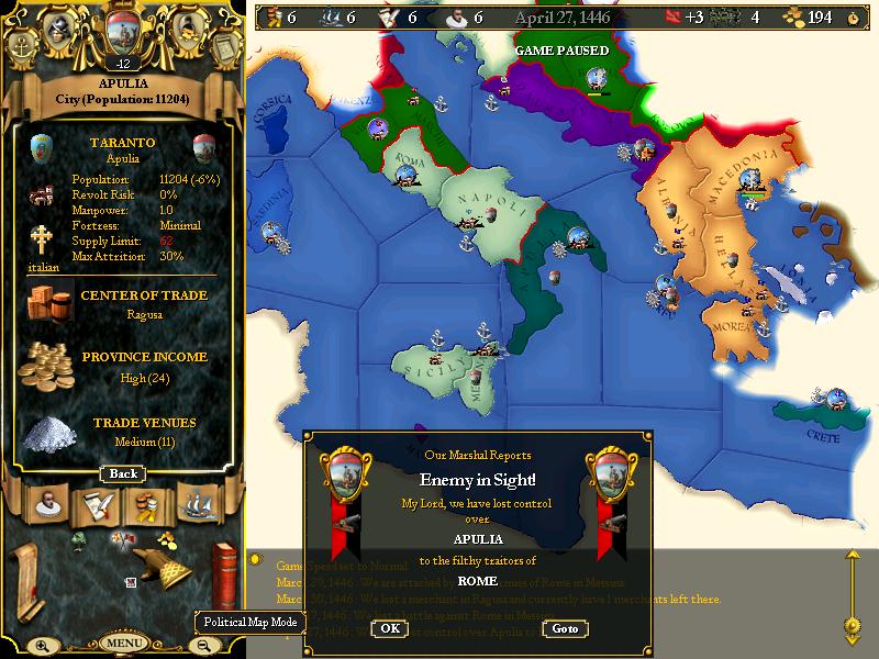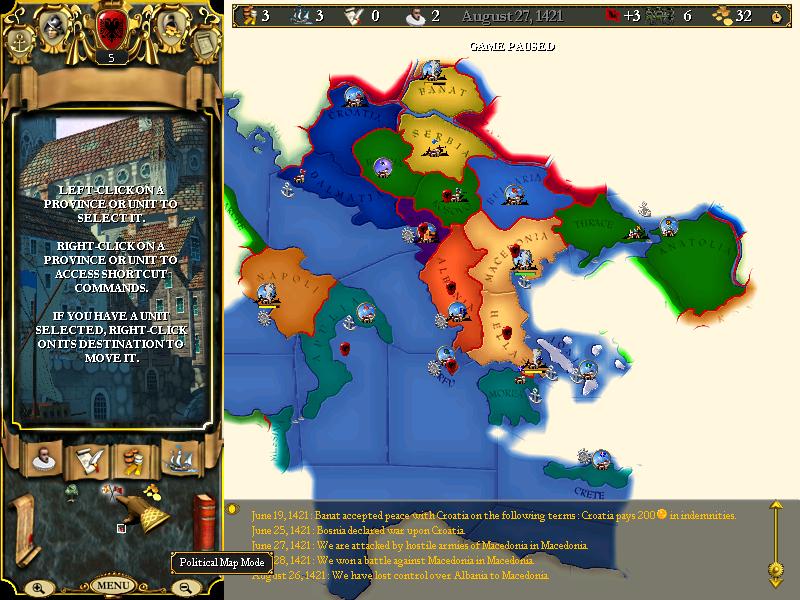 Tragically enough the first declaration of war that we hear of is Konya's declaration on us, and our brave monarch Hamza prepares his soldiers for the onslaught of the infidels. They invade in May of 1419 and are only beaten back by the last minute reinforcement of the new recruits that Hamza called up immediately after war broke out. And so in June, Hamza persued the retreating Konyites back into their squallid hovels. However, we are in our turn were beaten back and persued into our homelands were we were beaten again. Hamza rallied his forces in the wastes of Aleppo before counterattacking and being beaten again. Meanwhile war raged all around and Smyrna had annexed Anatolia.