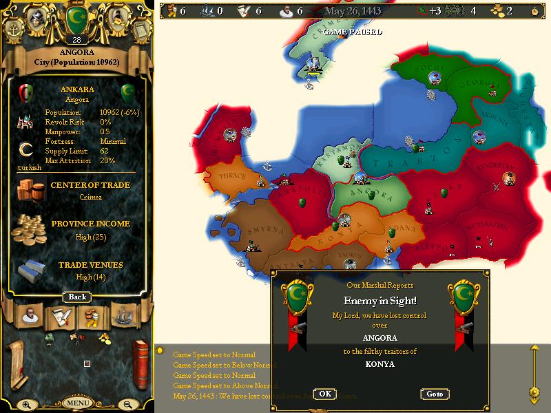 In a final desperate gamble, Hamza's forces snuck through the enemie's lines in Adana and beseiged the warmongering scum in Konya. But despite beating off several attacks by the Konyites, Adana fell to the invaders in September of 1420