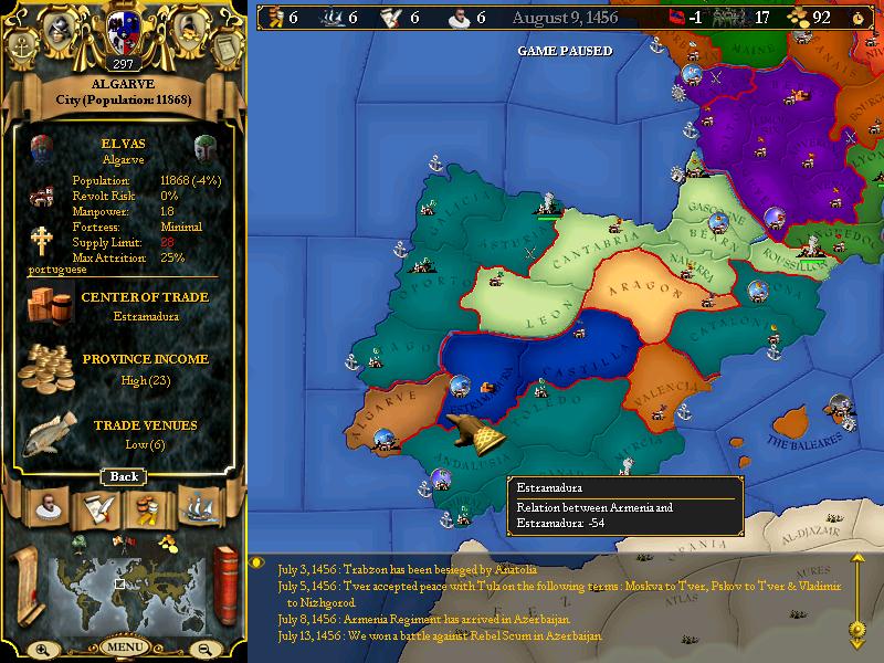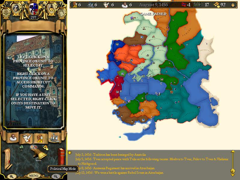 In the Independent Europe Scenario Adana starts with an effective monarch (Hamza I) and its back to the edge of civilization (in IES every province is an independent nation so the number of provinces occupied by a country is somewhat limited), giving it a measure of security, although I remained bordered by the nation of Taurus, Konya, Sivas and Angora which are all Islamic while I am Orthodox. My 10,000 soldiers plan to wait for my neighbors to fight amongst themselves and then wait for an opportunity to annex one of them while their soldiers of off fighting elsewhere.