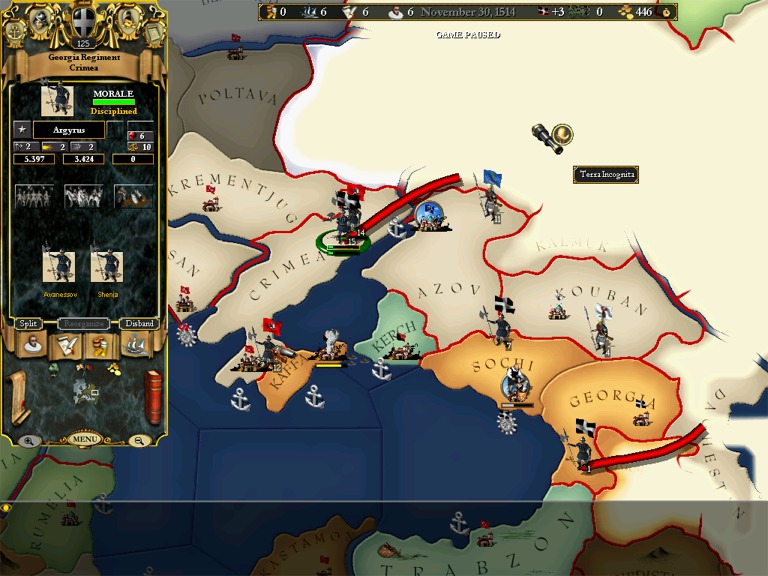 Georgia is the first to move in, bypassing the rebel-controlled province Kerch (owned by Genoa) and attacking the Genoan army in adjacent Kaffa. They lose. By this time, I had captured Crimea from the Papal States. But instead of retreating towards home, the defeated Georgian army is now marching through Crimea, and is still doing so many months later. My troops are suffering attrition because of this, and I'm wondering how it could be taking them so long to move through the province? So I save the game and reload as Georgia.