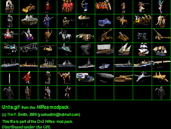 I've busy browsing through various unit sets to create a new standard isometric set for Freeciv. The units are photorealistic and look very cool but they don't seem to fit the general theme of the orginal Civ2 units. Does any of you have some original units to spare (and willing to release under the GPL) or would like to help with collecting a new set?