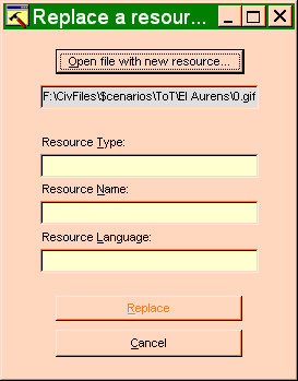 From the help file, it looks like I should treat the GIF's as 'other resource'. So when I select "Action|Replace Other Resource", I get the attached dialog. Can't figure out what to do next.