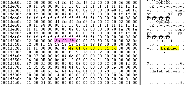 Now, how do we find the coordinates of Baghdad amoung all these pairs of numbers? Well, if we look for the numbers 59 and 41, we won't find them. So let's refer to William Keenan's ToT tip and use the calculator to convert these into hexidecimal numbers: 3b,29. There they are, highlighted in pink. By changing these numbers (in hexidecimal) we can move Bagdad or any other city. But it's not that simple. More....
