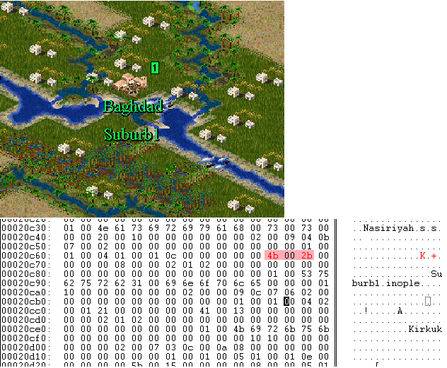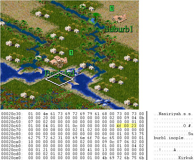 Now we use our hex editor to replace the old location with the new one, and voila, Suburb1 has moved to a location immediately south of Baghdad!