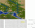 Bagdad starts as a normal, one square city located at 59,41 on our map. Let's find it in the sav. file using the hex editor. This is pretty easy, since in the right hand column, the names of cities are printed (highlighted in yellow). The corresponding hexidecimal code for 'Baghdad' is also highlighted in the centre portion. This section is the actual contents of the sav. file, consisting of many, many rows of 16 pairs of numbers, mostly empty (00). The left hand column is the 'offsets' referred to in Allard's and Mercators's papers. This is just the index to allow you locate which row you're looking for, counting in hexidecimal numbers.