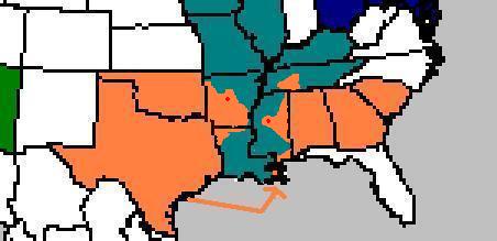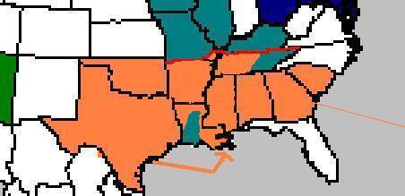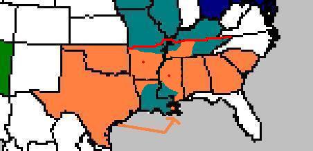The war has had its final advances and has now come to a close. Arkansas, St. Louis, Mississippi, and most of Louisiana and Tennessee are now under complete Confederate control. The POOP government seems to be defunct--which would be expectable if their army and navy suddenly disintegrated under Confederate advancement--but the CSA has limited itself to the peace treaty line designated in the map.