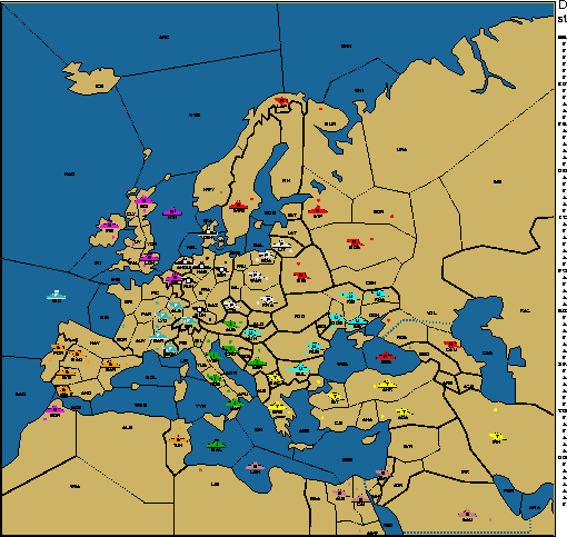 But now the question of who to attack is raising its ugly head. I've sort of got a Western Triple set up with France and Britain to sweep east together. But I'm having a bit of a hard time prodding the frenchie into moving an offensive position against the Italian. Now from his point of view he doesn't want to end up with a two front war (not that much of a danger in view of the German's incompetance), but I'm a bit worried I might end up holding the bad and have to fight the Italians by myself, which I just don't have enough fleets to do effectively.