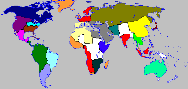 For 5 years the war raged on. The CSA, Canada, Columbia, Brazil, Germany, Italy, and the Ottoman Empire, or the Great Alliance (GA), fought the USA, West Canada, the WCI, Mexico, Argentina, Britain, and Russia, called the Free Allied Nations (FAN). AS the war progressed, it became more global. In 1859, Russia and Britain found an ally in Persia, who was eager to get revenge for earlier wars with the Ottomans. In Africa the Zulus and in Asia Siam helped Germany seize British colonies in 1860 and 1861. In 1861 the wars in South America and Canada ended. In South America, Argentina surrendered and gave up quite a bit of land to Columbia and Brazil. Mexico also made peace with Columbia, forfeiting a small area of land. In Canada, WEst Canada finally fell. Some of the southernmost tribes joined the WCI, and the rest fell to Canada.