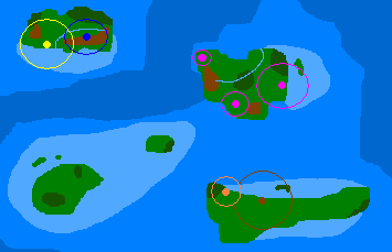 Next, look at the yellow and blue cities in the upper left corner. These cities are at peace, and their circles overlap. This means that each city gains some produce from the land in both circles, though not as much as if one city owned the land solely. However, niether ruler has decided that the extra production is worth a war. These cities also get favorable trade deals with each other due to the circles overlapping; no wilderness needs to be traversed to complete the trade, so the inital cost of the trade is low.