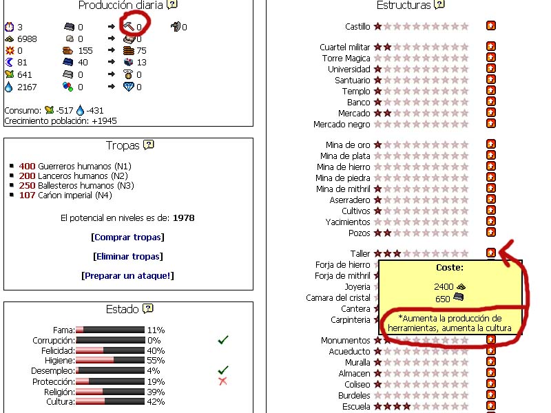 y miren esto.. 3 ESTRELLAS EN EL TALLER!! que se supone sirve para la creación de herramientas, y en el listado de producción 0! CERO!!! de herramientas en esa ciudad.. no entiendo nada