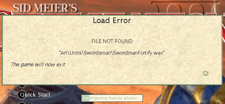 Cree un escenario donde la única modificación es el mapa y dejé todo lo demás en defaut, salvo por las starting locations todo lo demás está igual... pero cuando construyo algunos "Pikeman" me aparece un error que no encuentra el archivo "PikemanFortify.wav"