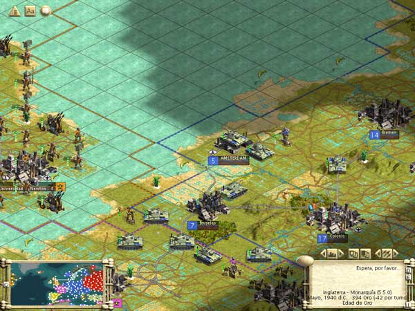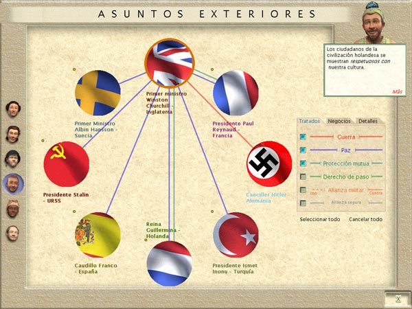 ) del escenario original del civ2. Hay 8 civs: Alemania (que para simplificar el ecenario engloba a Italia, Austria, Checoslovoquia, Hungría, Noruega, Dinamarca, Finlandia, Polonia y Rumanía), Inglaterra (con los EEUU, Grecia e Islandia), la URSS, Francia (aliada con Inglaterra), Holanda (con Bélgica y Yugoslavia), Suecia (neutral con Irlanda, Portugal y Suiza), Turquía y España.