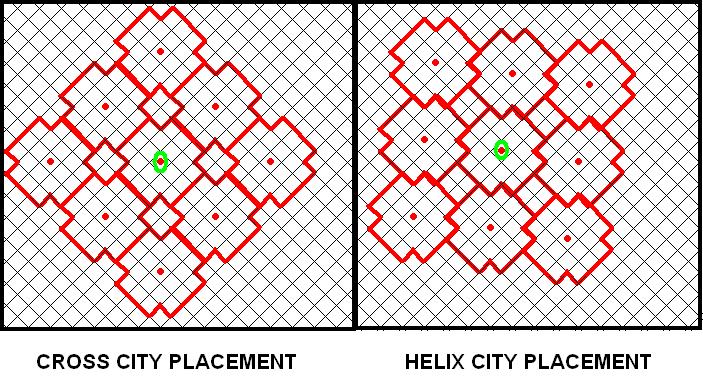 El diagrama recoge las casillas con nivel de distancia de 0 a 5. Como se puede ver se van dibujando “anillos” concéntricos de forma cuadrangular de dos casillas de grosor. Parece, a priori, que las ciudades que se sitúen en dirección diagonal a la capital tienen ventaja sobre aquellas que se sitúen sobre la vertical o la horizontal, debido al hecho de que una ciudad a 5 casillas de la capital tiene en la diagonal una d = 2, mientras que si se sitúa en la vertical o la horizontal, tiene una d = 5 y por tanto una corrupción por distancia inicial mayor.